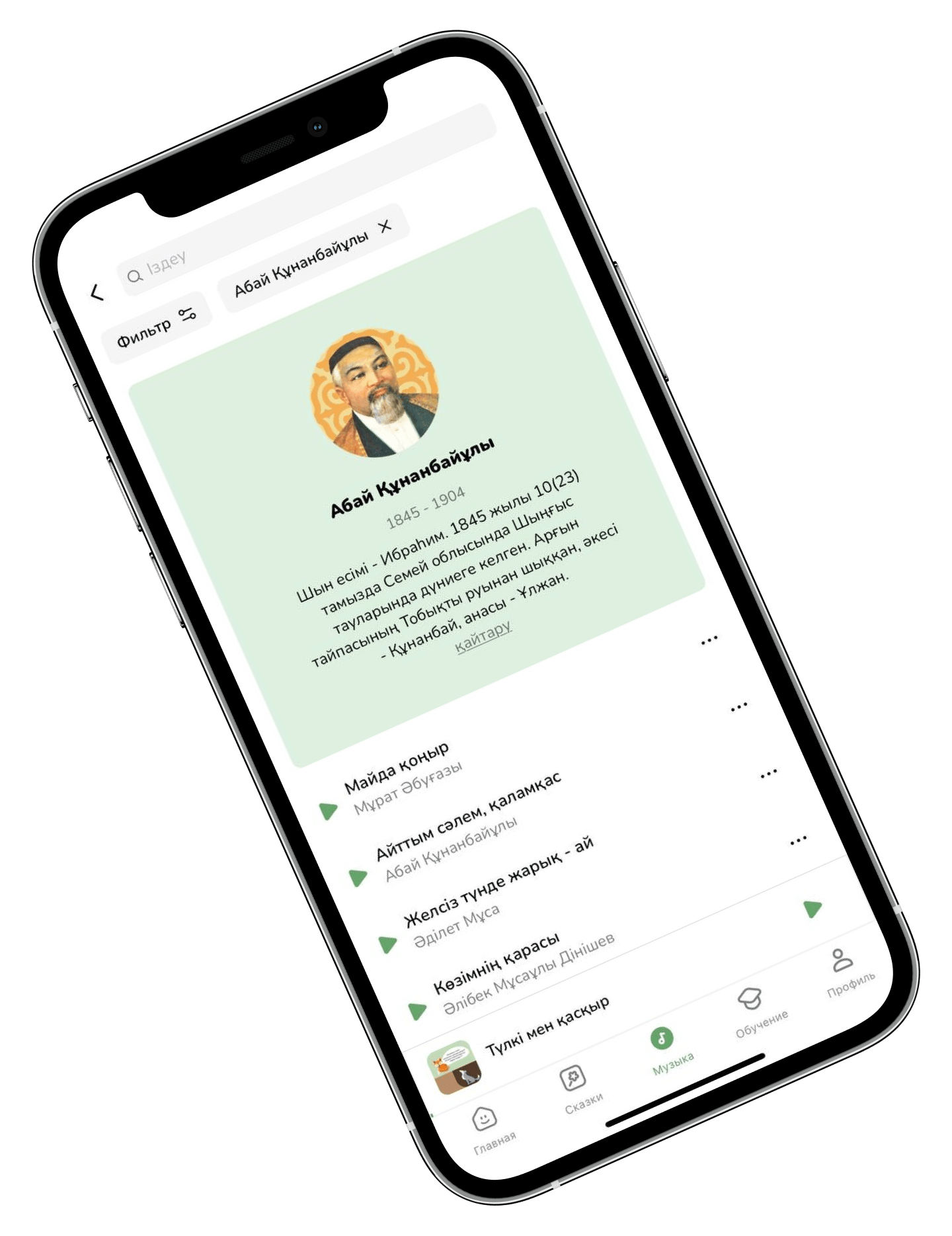 Қазақ халқының мәдени мұрасын, атап айтқанда, 1200-ден астам ең танымал туындыны қамтитын мобильді қосымша.